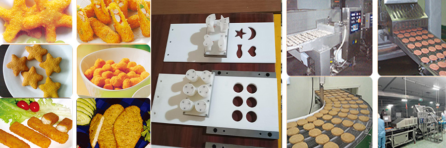 Supports single or double cake molding, and the mold can be customized to meet different specifications .It can be equipped with sizing machines, coating machines and other equipment to form a complete production line.Endless patterns can design for fabulous meat food products: round, square, ellipse, triangle, heart and some other patterns such as cartoon, star…